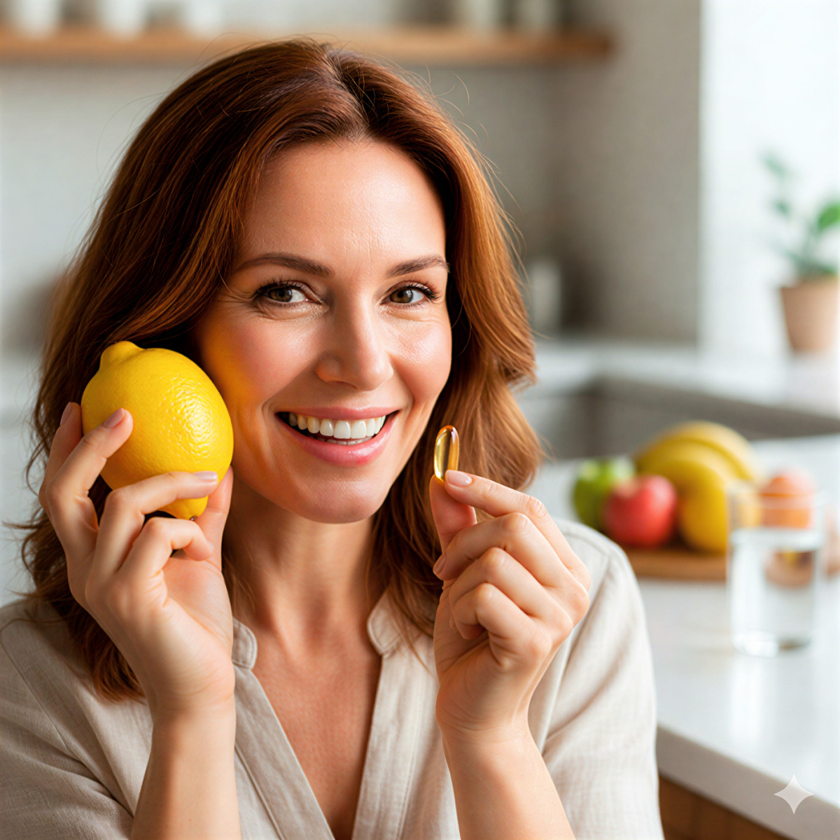 - Приём витамина С внутрь (нутрицевтики) позволяет обеспечить системную антиоксидантную поддержку, способствует синтезу коллагена и защите кожи изнутри — что особенно важно в условиях хронического стресса, негативных экологических факторов и гормональных изменений [1].